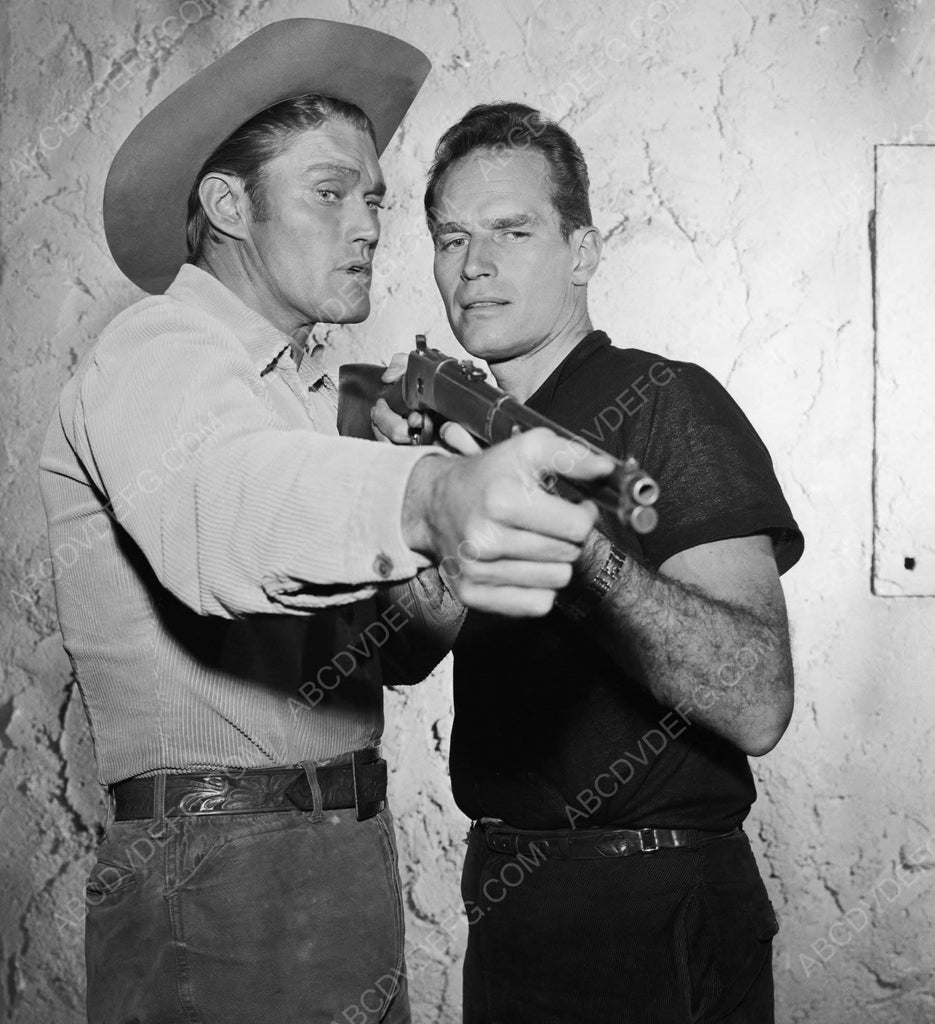 candid Chuck Connors Charlton Heston inspect the Winchester rifle 8b20-7020