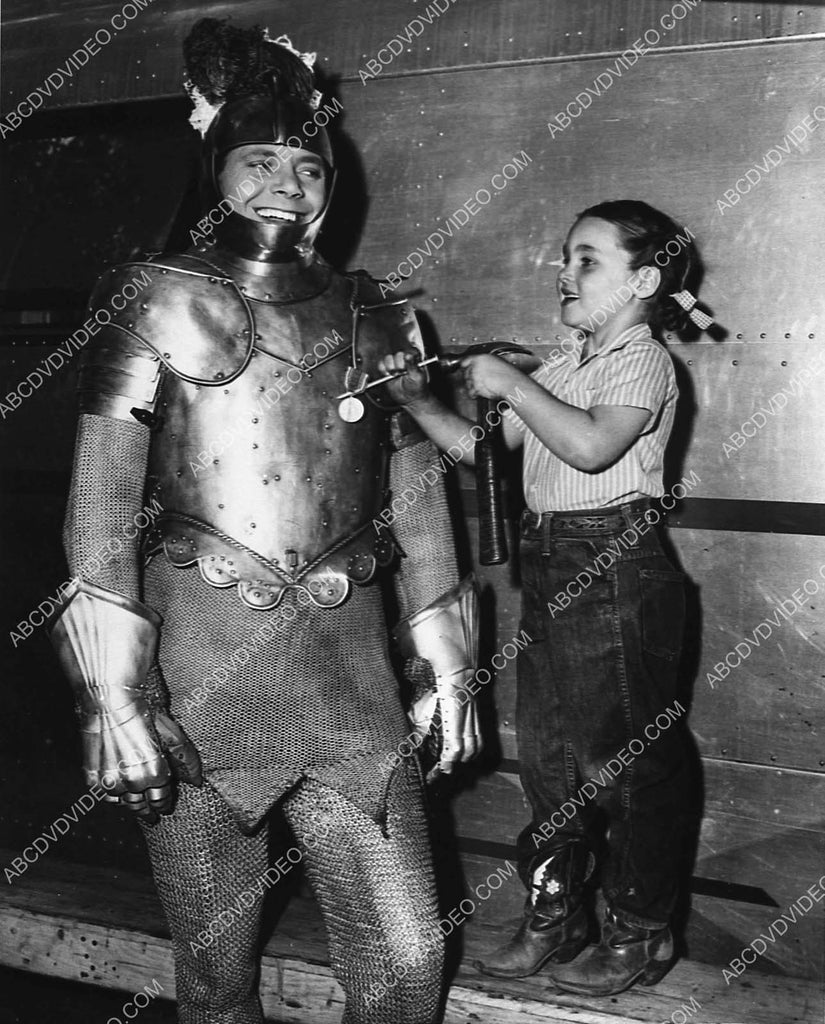 candid Louis Hayward gets medal hammered to suit of armor on set film The Black Arrow 2996-07